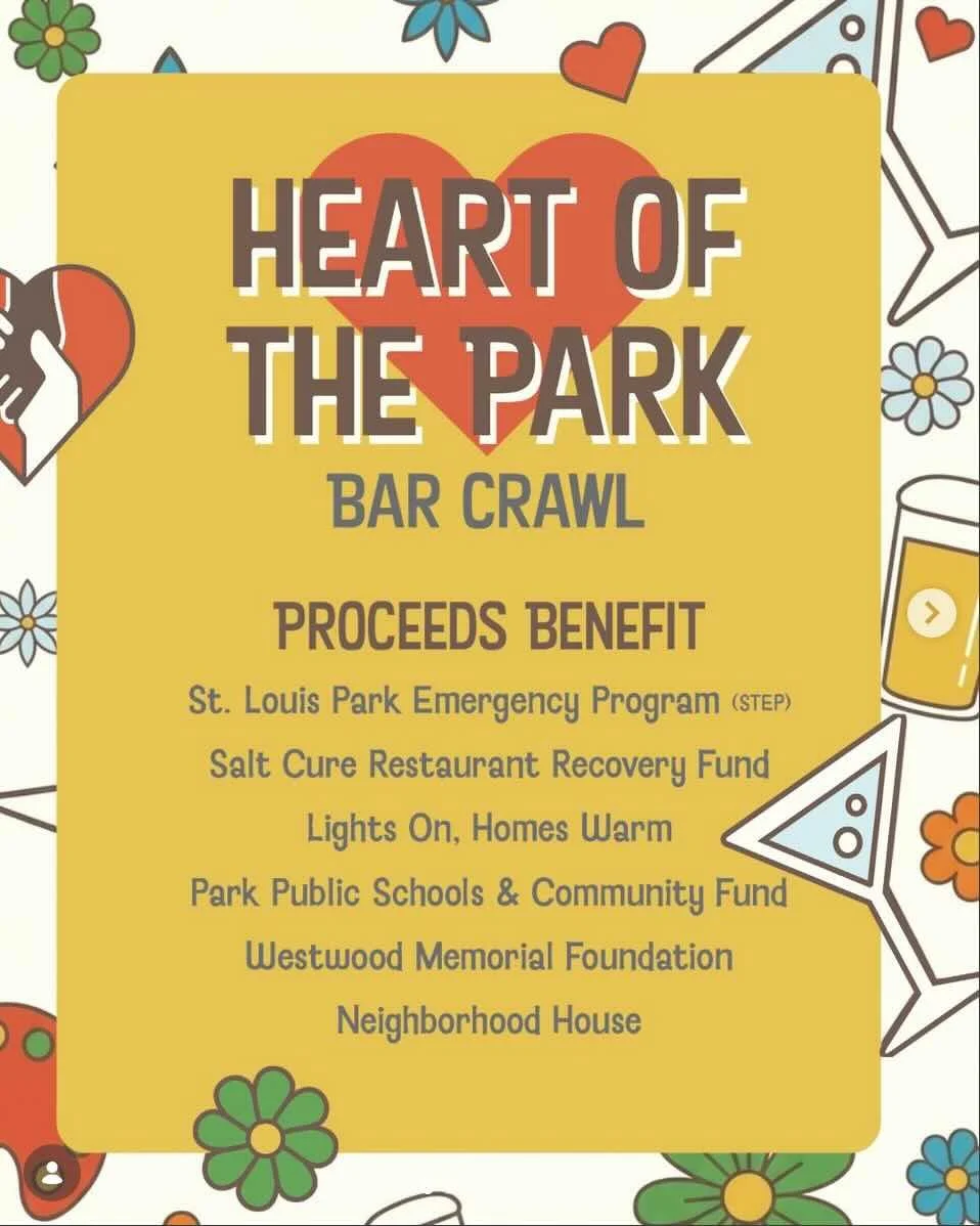 Raise a glass, lift up our community! This event is organized by a group of St. Louis Park neighbors. Join us to support our neighbors and local businesses by raising funds for local nonprofits. Register below with a suggested donation of at least $30. There will be at least five stops on the bar crawl throughout SLP. Stay tuned to the @HeartofthePark Instagram page for the most up-to-date information. Questions? Email heartoftheparkSLP@proton.me.