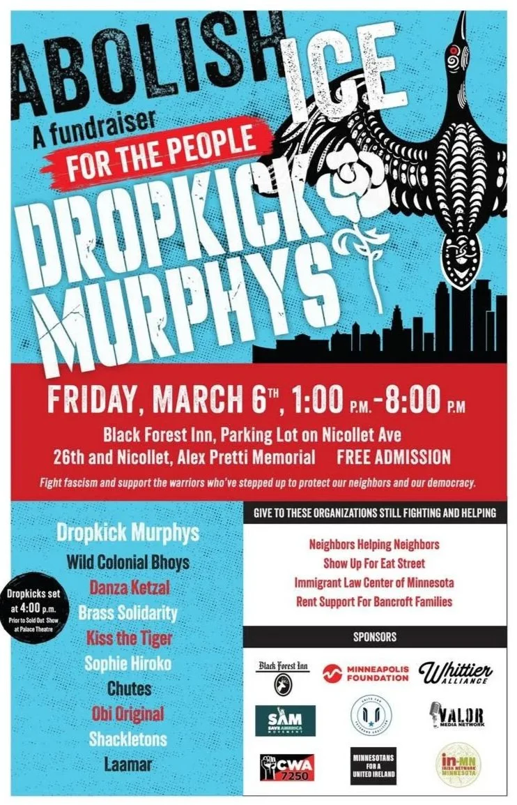 Abolish ICE: A Fundraiser for the People Friday, Mar. 6 •1 – 8 PM • free Alex Pretti Memorial (26th St E & Nicollet Ave)