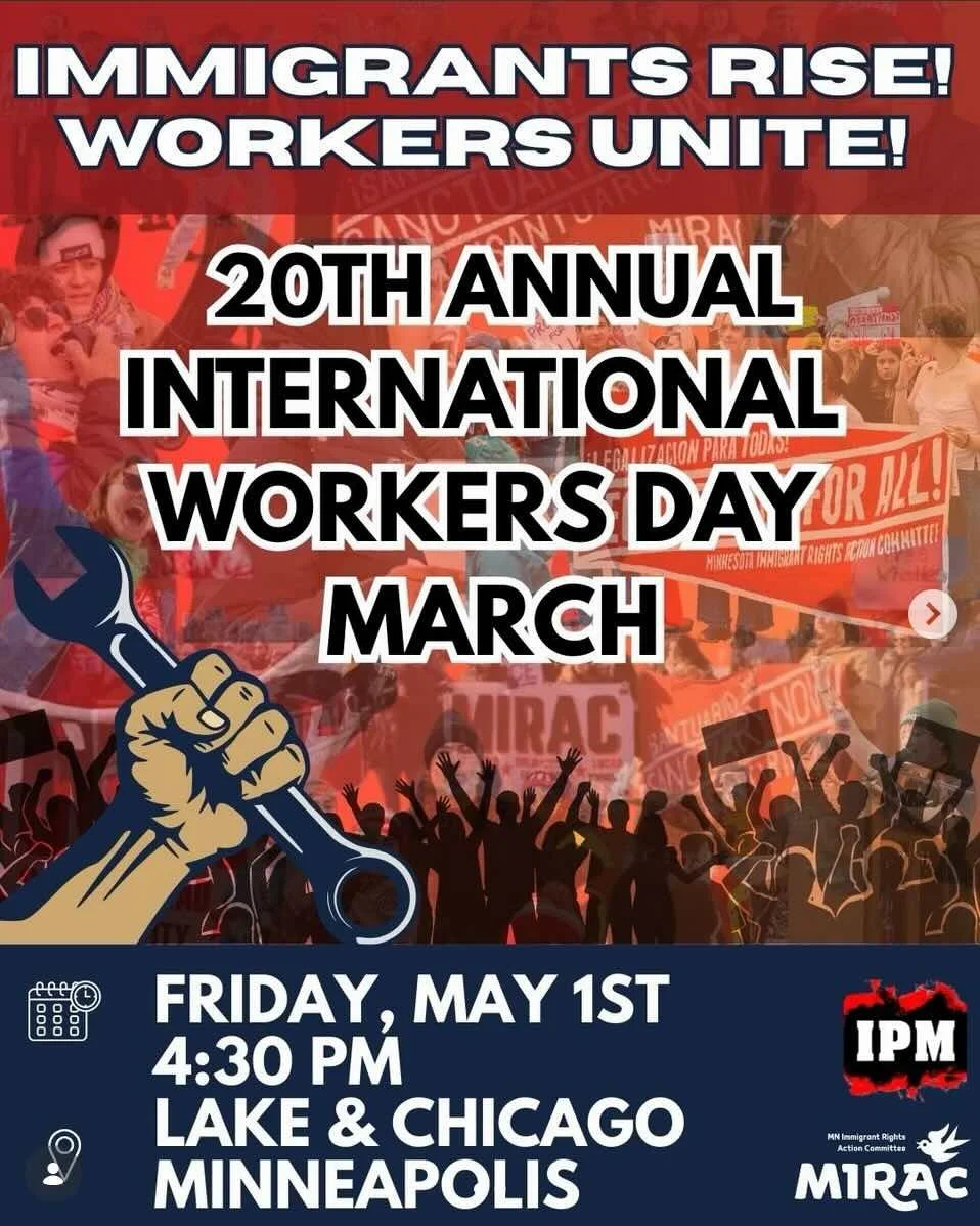 This May 1st we will continue our 20 years of resistance since immigrants reclaimed May Day in the United States! No to deportations! No to attacks against immigrants! Legalization for all! May 1, 2026 will mark 20 years since millions of immigrants took to the streets to fight against racist attacks. For the past 20 years, MIRAC has organized marches in Minnesota to demand equality and dignity for all immigrants and to commemorate International Workers’ Day.